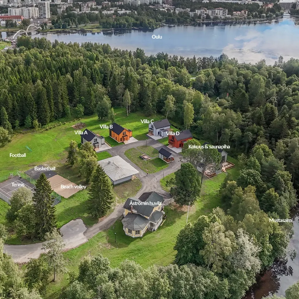 Neljän huvilan kokonaisuus, idyllinen saunapiha ja Åströmin historiallinen huvila – kaikki rauhallisessa ympäristössä, aivan Oulun keskustan kupeessa. Aluekartasta näet helposti palvelut ja sijainnit.